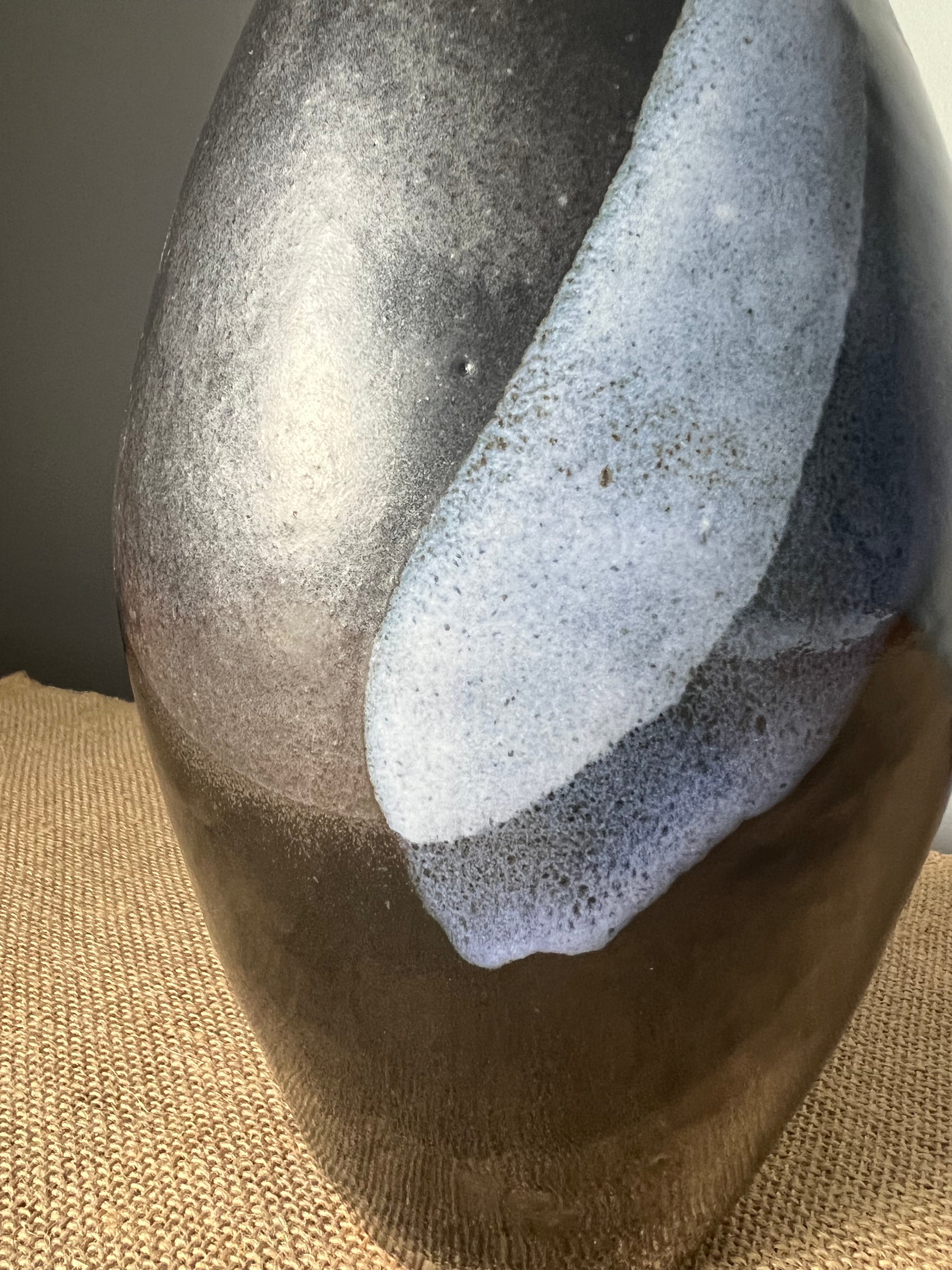 This vase is hand thrown on the pottery wheel using stoneware clay. The elegant shape is covered with subtle shiny and matte black glazes. A splash of white glaze turns to a speckled blue when layered over the shiny surface.