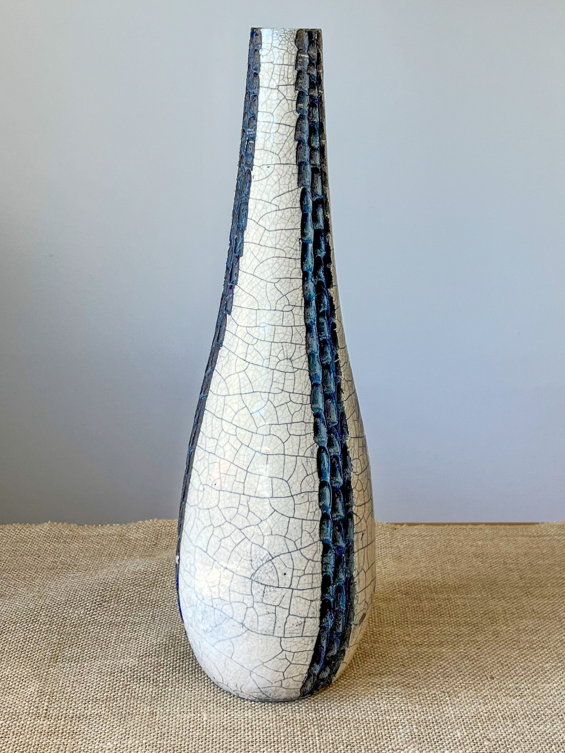 Wheel thrown vase using stoneware clay. The hand was hand carved before it was fired with the Raku technique. The Raku technique is achieved when glazed ceramics are taken from the kiln while they are still glowing red hot and then placed in a closed container with combustible material, such as sawdust or newspaper. This technique is used to starve the piece of oxygen and in this case resulted in a white crackle glaze and where there is no glaze the piece turned a matte black.
