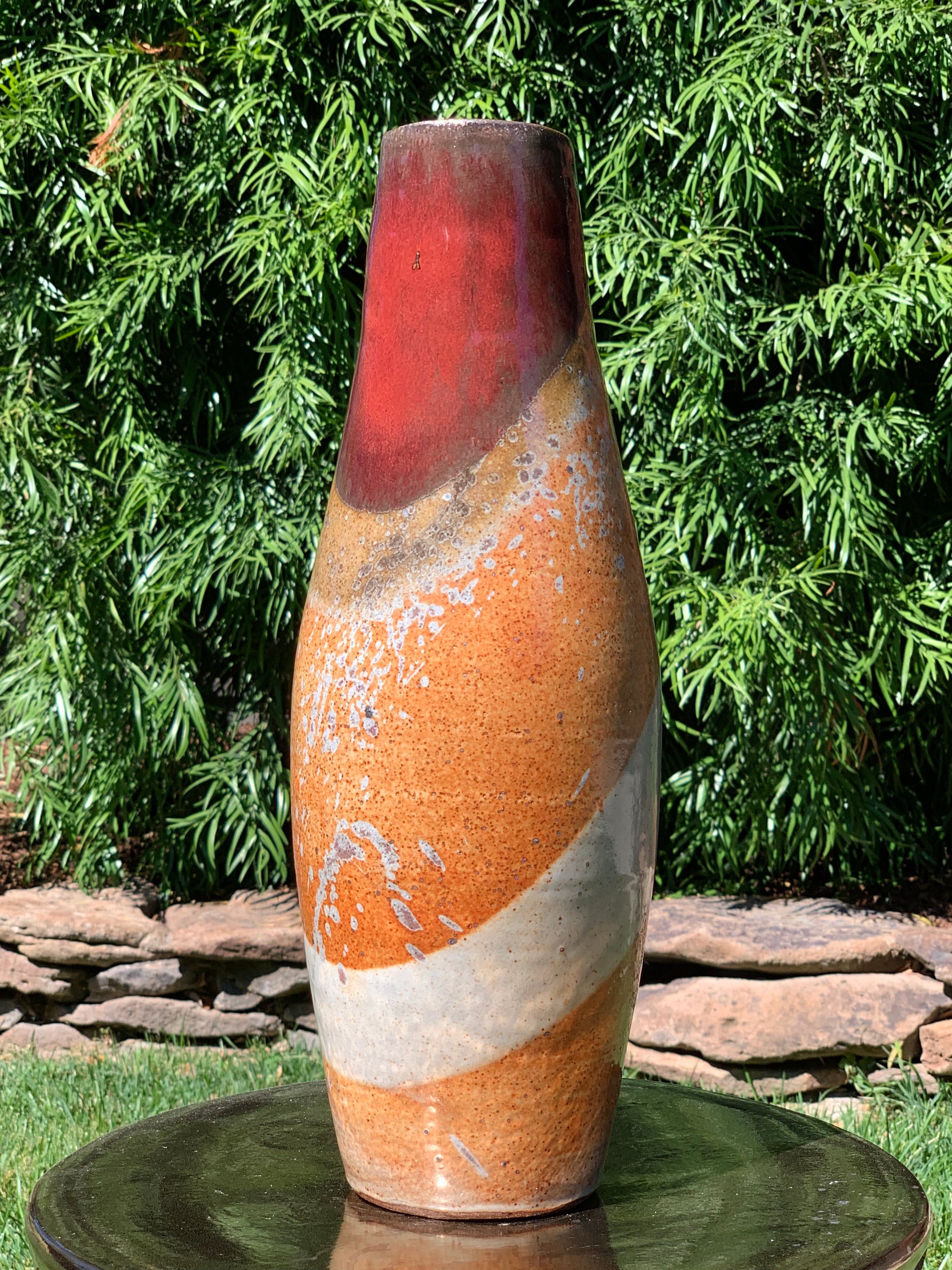Wheel thrown cylinder using stoneware clay. The surface features layered shino and red glazes. Lamp body is ready to be wired.