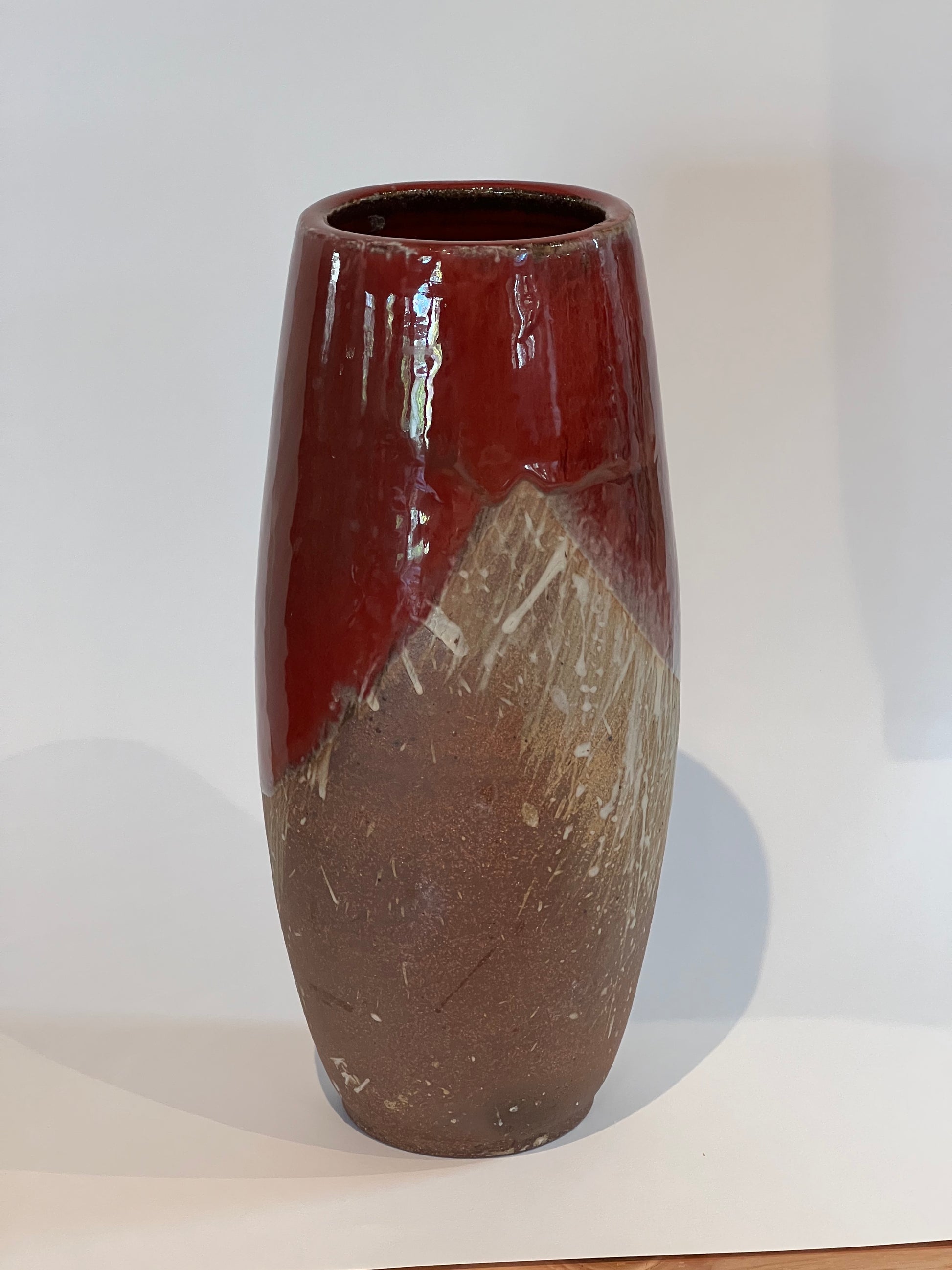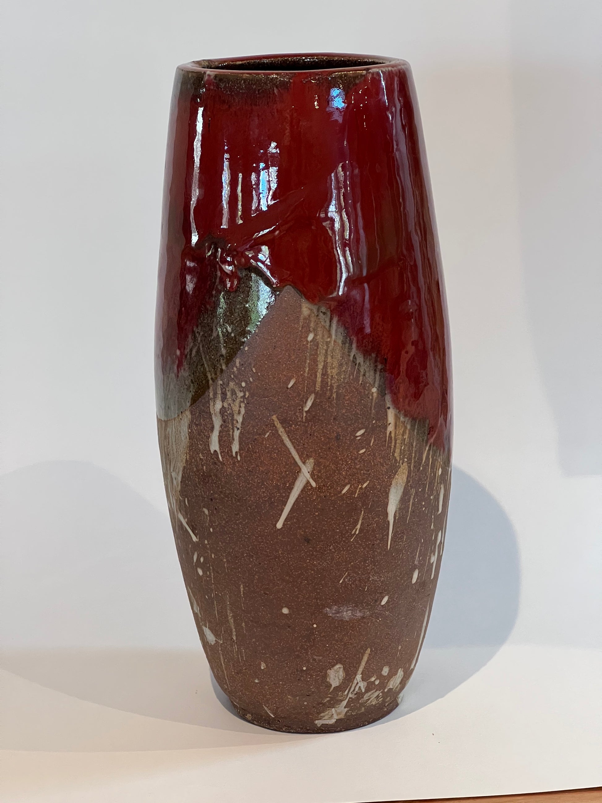 Wheel thrown ceramic vase using stoneware clay. The dark brown clay body is splashed with a white engobe the dipped in Pinnel' red glaze.